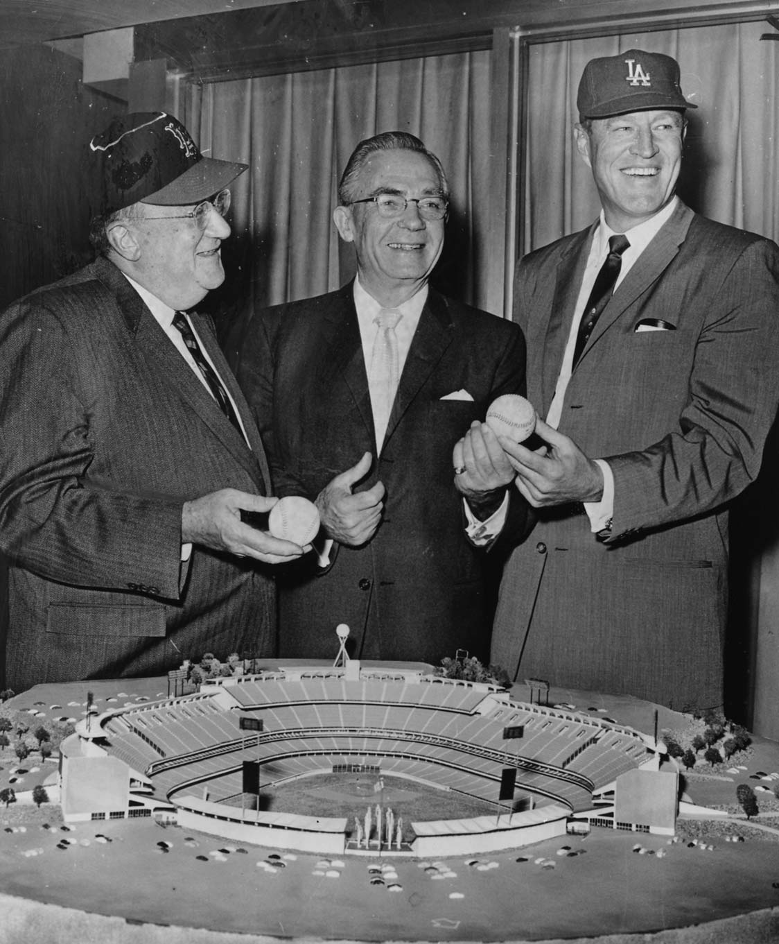 On December 12, 1961, Walter O’Malley, Chad McClellan, Chairman of Opening Ceremonies Committee, and Angels Chairman and part-owner Bob Reynolds smile over a model of Dodger Stadium, set to open for the 1962 season. O’Malley, owner of the Dodgers wears an Angels hat and Reynolds, the Angel president, wears a Dodger cap. The Angels would play their home games in Dodger Stadium from 1962-1965.