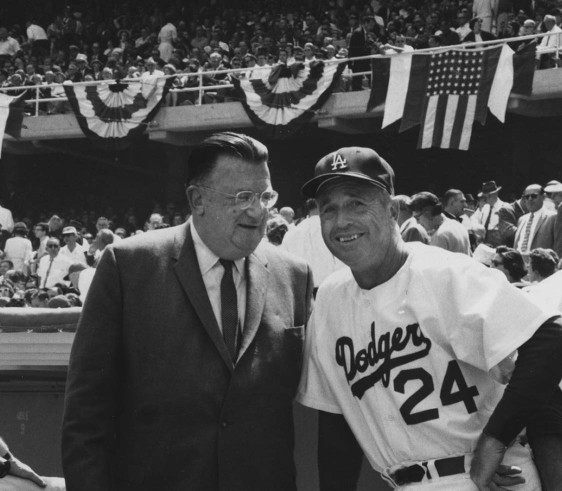Walter O’Malley and Dodger Manager Walter Alston celebrate the opening of Dodger Stadium on April 10, 1962. O’Malley privately built beautiful Dodger Stadium, which was widely considered the finest ballpark by fans and the press, calling it “Taj O’Malley”.