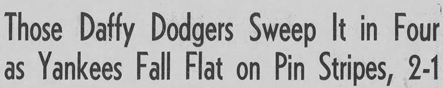 Dodger pitching, with a league-leading ERA at 2.85, best in 21 years (since 1942), handcuffed the Yankees. The Yanks’ four runs were the lowest total in a four-game Series and they batted only .171. For the Dodgers, it was the 10th straight World Series game in which a rival starting pitcher failed to complete a game (last time was in 1956 Game 7 by Yankees’ Johnny Kucks).