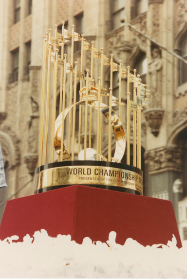 The 1988 Commissioner’s World Championship Trophy for winning the World Series is on display along the parade route in downtown Los Angeles to celebrate the Dodgers’ four games to one victory against Oakland for the World Championship, their sixth in team history.