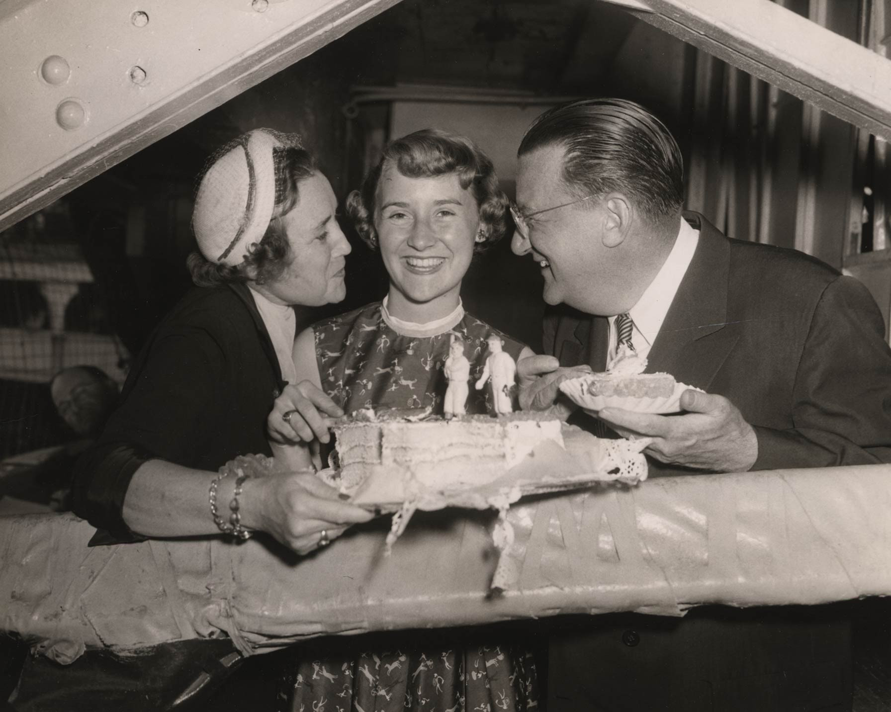 Kay and Walter O’Malley celebrate daughter Terry O’Malley’s 21st birthday at Ebbets Field on May 16, 1954. Photo by Barney Stein