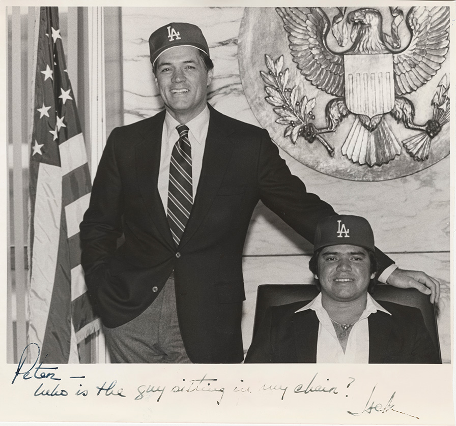 United States Ambassador to Mexico Jack Gavin stands behind Dodger pitching sensation Fernando Valenzuela who sits in the Ambassador’s chair at the U.S. Embassy in Mexico City. Gavin was an actor and served as Ambassador from 1981-1986. Fernando had completed his remarkable 1981 season as the National League Rookie of the Year and Cy Young Award winner leading the Dodgers to a 1981 World Championship. “Fernandomania” became an international baseball phenomenon and Fernando’s popularity was off the charts. Gavin, circa Fall 1981, adds his own humorous caption at the bottom of the photo he sent to Dodger President Peter O’Malley: “Peter, who is the guy sitting in my chair?”