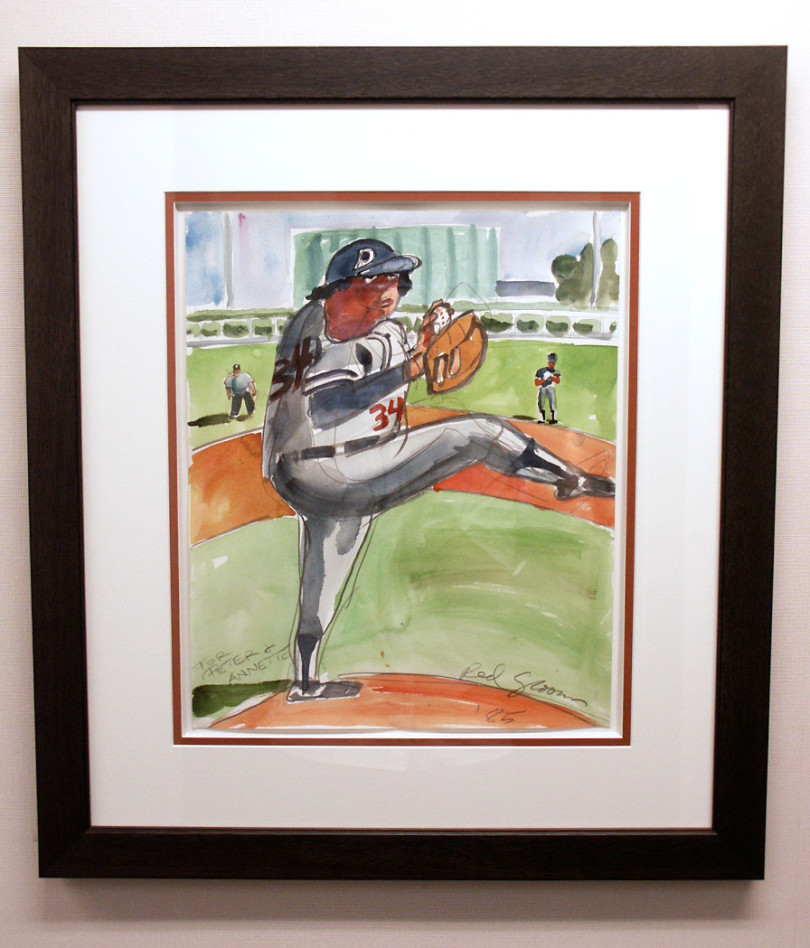 Watercolor painting of Fernando Valenzuela by colorful pop artist Red Grooms in 1985. Charles Bronfman, owner of the Montreal Expos commissioned Grooms for artwork during Spring Training. Valenzuela was pitching for the Dodgers at West Palm Beach Municipal Stadium and Grooms thought he was a great subject. Bronfman then made a gift of the original painting to Dodger President Peter O'Malley and his wife Annette.
