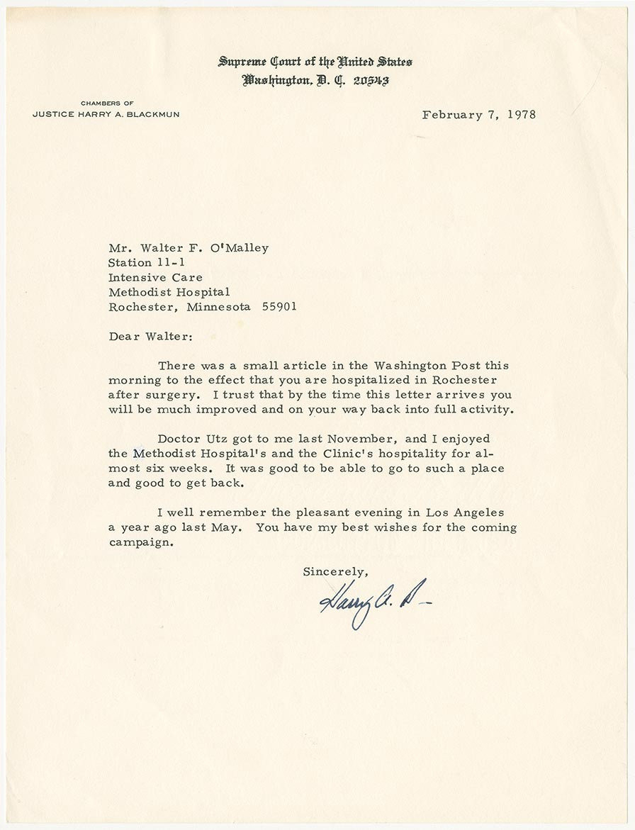 U.S. Supreme Court Justice Harry A. Blackmun sends his well-wishes to Walter O’Malley at Mayo Clinic in Rochester, Minnesota upon reading an article in The Washington Post that O’Malley had undergone surgery. Blackmun writes, “I trust that by the time this letter arrives you will be much improved and on your way back into full activity...I well remember the pleasant evening in Los Angeles a year ago last May.”