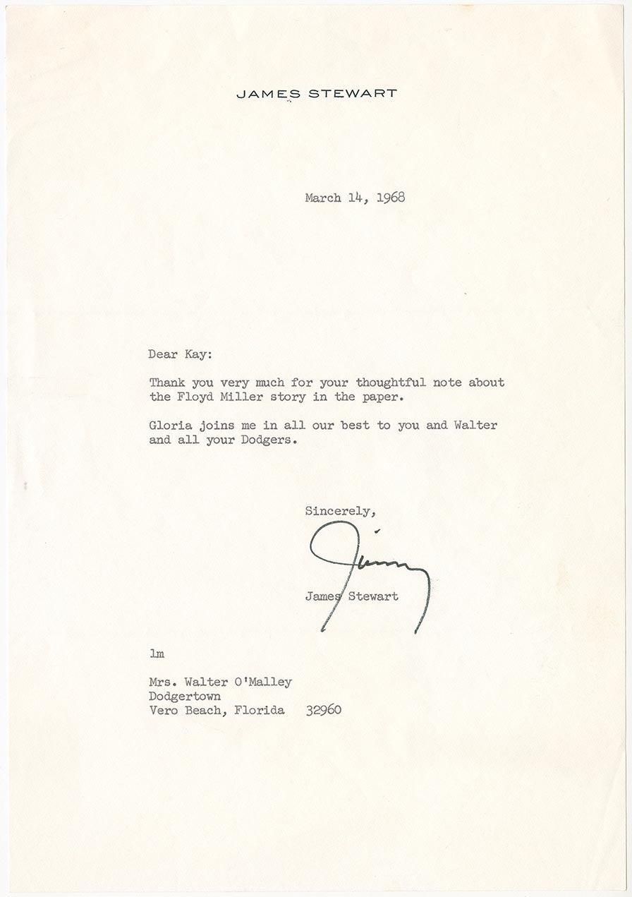 Academy Award-winning actor Jimmy Stewart writes a thank you letter to Kay O’Malley in which he says, “Dear Kay, Thank you very much for your thoughtful note about the Floyd Miller story in the paper. Gloria (Stewart’s wife) joins me in all our best to you and Walter and all your Dodgers.” In the article written by Stewart as told to Miller, Stewart relates how his father Alexander bonded with him after they went to see the funeral train for President Warren Harding about 20 miles away from their hometown of Indiana, Pennsylvania. Alexander Stewart handed his son two pennies and told him to place them on the railroad tracks before the train arrived. He did and after the train passed, Jimmy picked up the flattened Indian head coins. His father took one and placed it in his pocket and Jimmy kept the other one. “For years, Dad and I carried those coins flattened by the weight of history. And the knowledge of what we shared made me feel very close to him,” Jimmy wrote in the article that appeared in the Los Angeles Herald-Examiner.