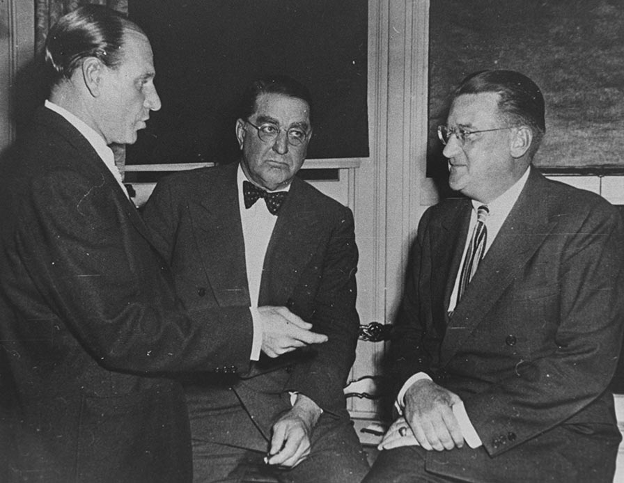 Leo Durocher, Dodger President Branch Rickey, and Dodger Vice President and General Counsel Walter O’Malley are in Pittsburgh on May 7, 1946 to discuss the club’s injunction enjoining Jorge and Bernardo Pasquel of the Mexican League from “unlawfully interfering” with the Dodgers by persuading Brooklyn players to break their contracts.