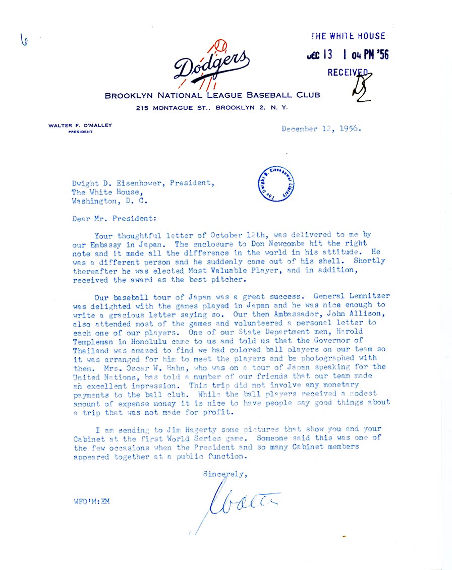 December 12, 1956 letter from Walter O’Malley to U.S. President Dwight Eisenhower after the Dodgers’ 1956 Goodwill Tour to Japan. Eisenhower sent an October 12 letter in care of O’Malley for Dodger star pitcher Don Newcombe while on the tour.