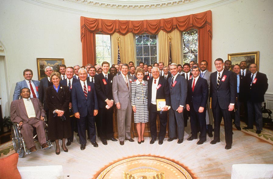 October 26, 1988, the Oval Office, The White House, Washington, D.C., President Ronald Reagan and First Lady Nancy Reagan greet the 1988 World Champion Los Angeles Dodgers. (Front, L-R) Roy Campanella; Terry O’Malley Seidler; Vin Scully; Roland Seidler; Orel Hershiser; President Reagan; Nancy Reagan; Tom Lasorda; Fred Claire; Ed Durso (Commissioner’s Office); and Peter O’Malley.