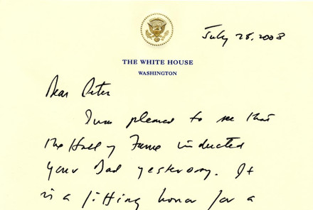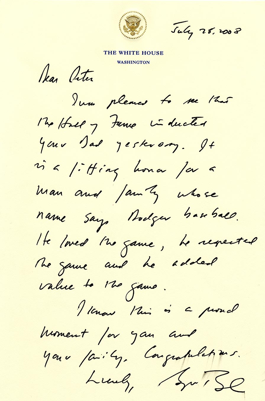 U.S. President George W. Bush hand writes a July 28, 2008 letter to Peter O’Malley congratulating him on the induction of his father Walter to the National Baseball Hall of Fame. President Bush writes, “He loved the game, he respected the game and he added value to the game.”