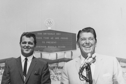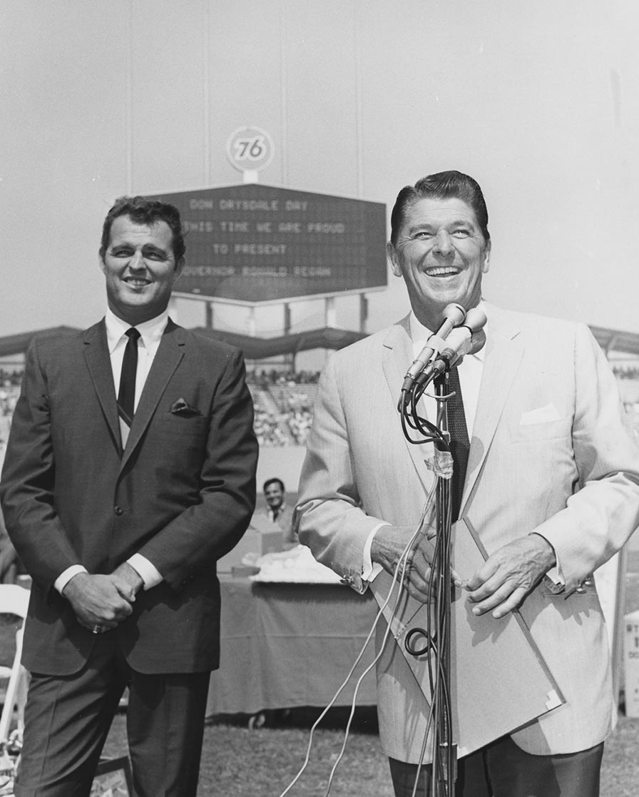 September 27, 1969, California Governor and future U.S. President Ronald Reagan addresses the Dodger Stadium crowd on Don Drysdale Day. Hall of Famer Drysdale retired in August after pitching for the Dodgers since 1956.