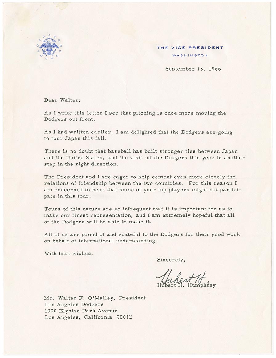 September 13, 1966 letter from U.S. Vice President Hubert H. Humphrey to Dodger President Walter O’Malley declaring how delighted he is that the Dodgers will be making a fall tour to Japan in 1966. He writes, “The President (Lyndon B. Johnson) and I are eager to help cement even more closely the relations of friendship between the two countries.”