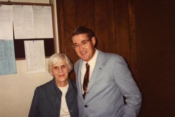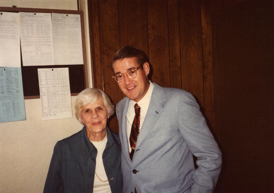 October 15, 1977, Game 4, 1977 World Series. Lifetime Dodger fan “Miss Lillian” Carter, mother of U.S. President Jimmy Carter, is welcomed to the Dodger Stadium President’s Box by Peter O’Malley. She was invited to throw the ceremonial first pitch.