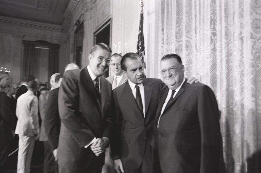 July 22, 1969, (L-R) Peter O’Malley; U.S. President Richard Nixon; Walter O’Malley. President Nixon holds a reception at The White House the day before the All-Star Game to be played at Robert F. Kennedy Memorial Stadium in Washington, D.C. Baseball Commissioner Bowie Kuhn stands behind Nixon.