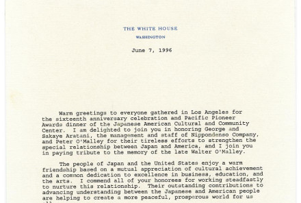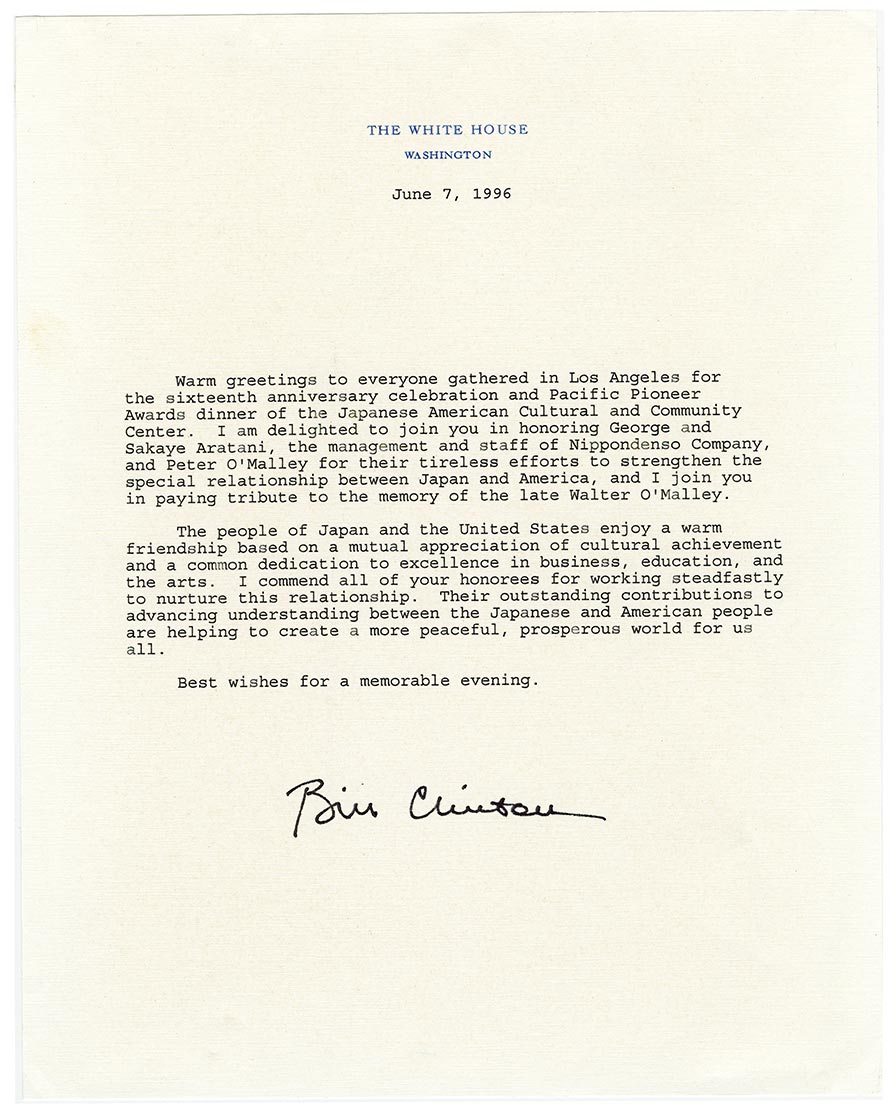 June 7, 1996 letter from U.S. President Bill Clinton to the Japanese American Cultural and Community Center regarding its honoring Walter and Peter O’Malley for their longtime friendship with Japan through baseball.