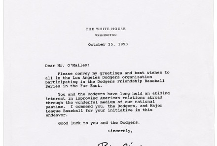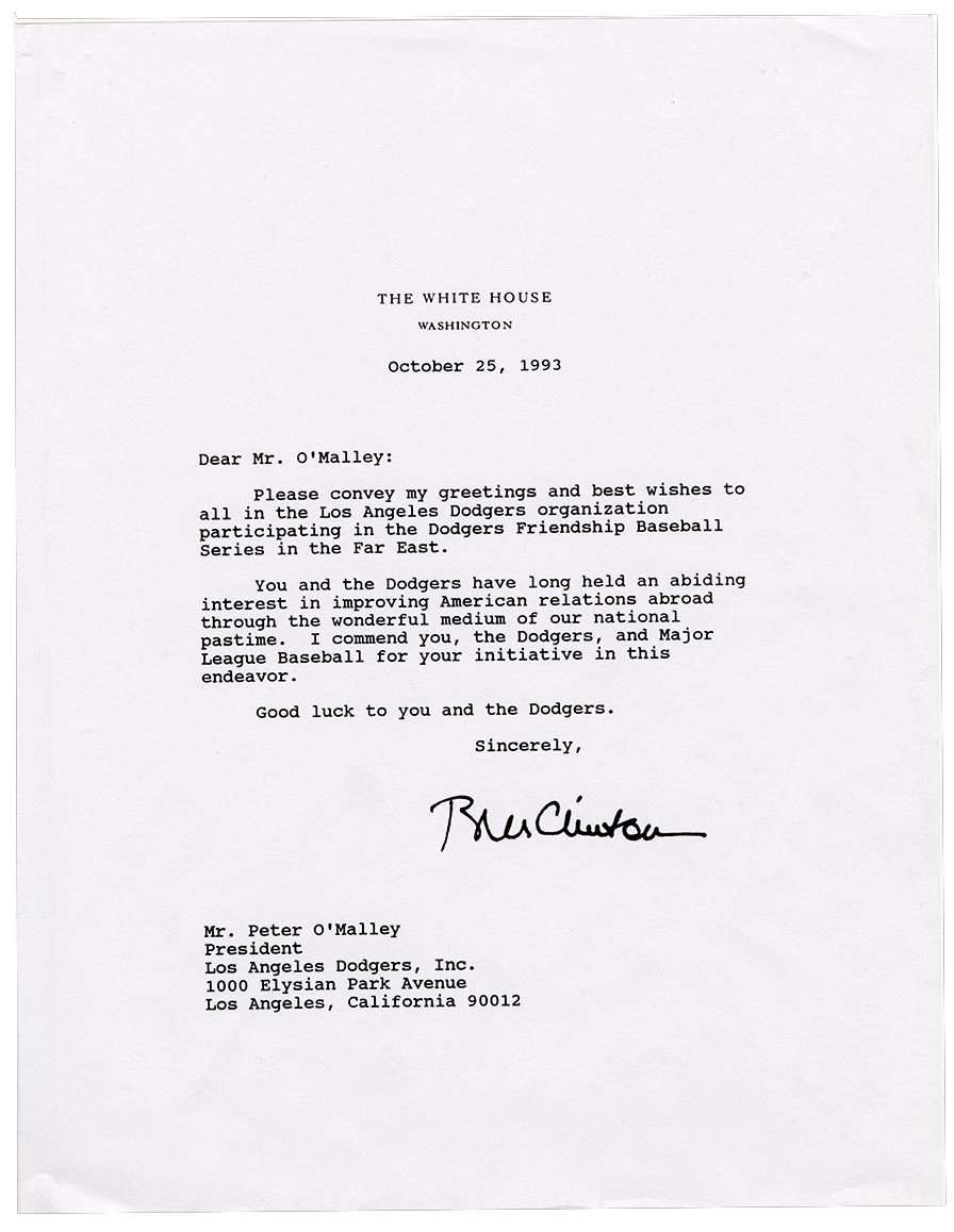 October 25, 1993 letter from U.S. President Bill Clinton to Dodger President Peter O’Malley wishing him and the Dodger organization well during the 1993 Dodgers Friendship Series to Taiwan and Japan.