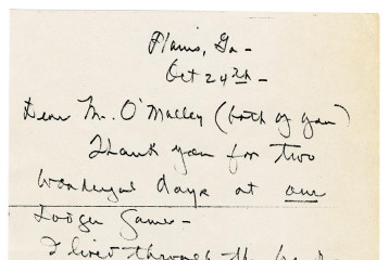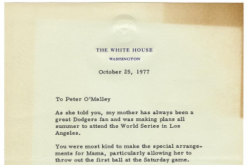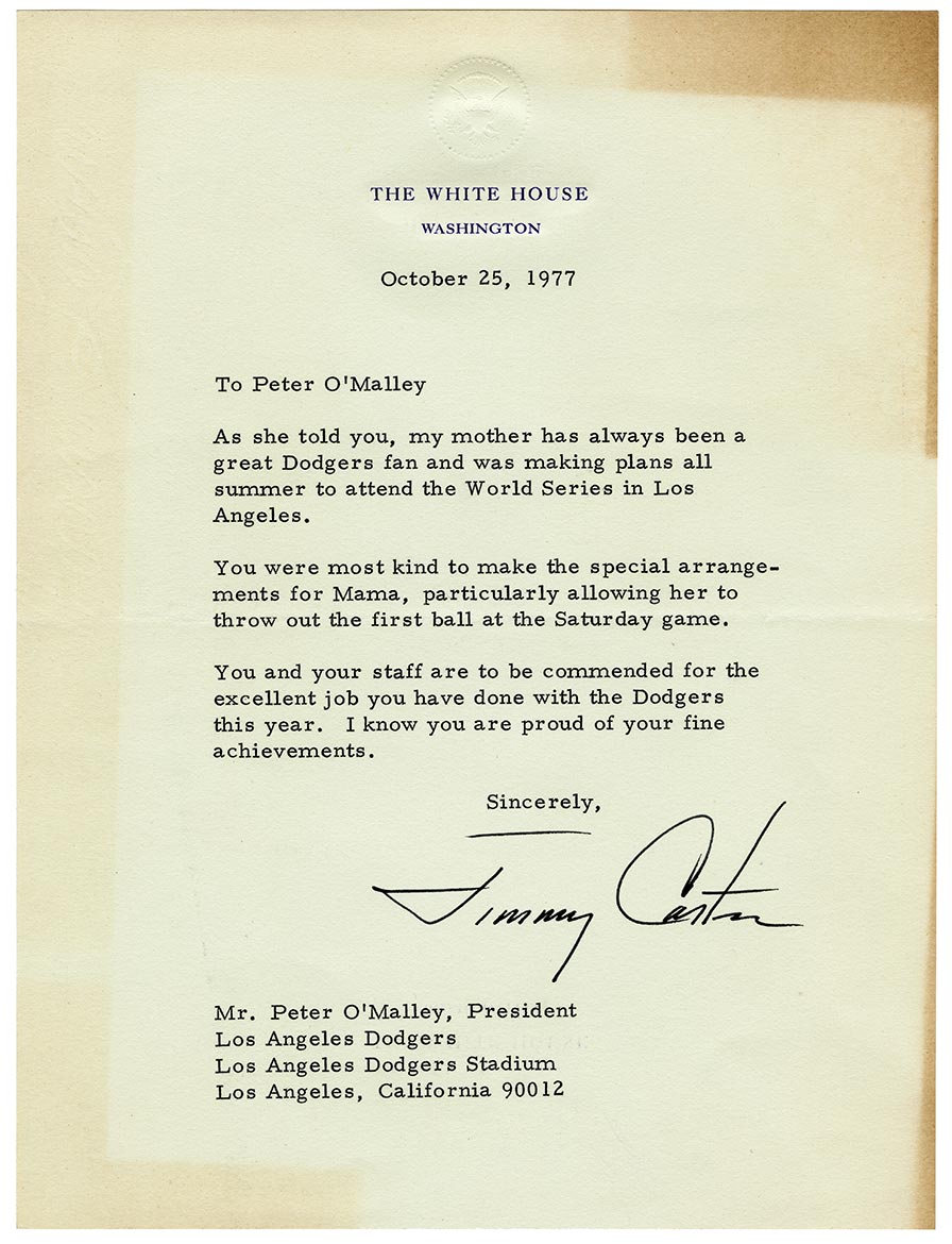 October 25, 1977 letter of appreciation from U.S. President Jimmy Carter to Dodger President Peter O’Malley for inviting Carter’s mother Lillian to throw the ceremonial first pitch for Game 4 of the 1977 World Series at Dodger Stadium.