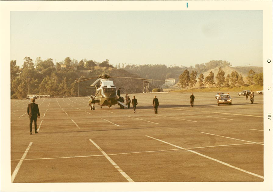 August 27, 1970, Marine One helicopter lands in the Dodger Stadium parking lot after transporting U.S. President Richard Nixon and his daughter Tricia from San Clemente. They then are driven to the Dorothy Chandler Pavilion in downtown Los Angeles for dinner and a show.