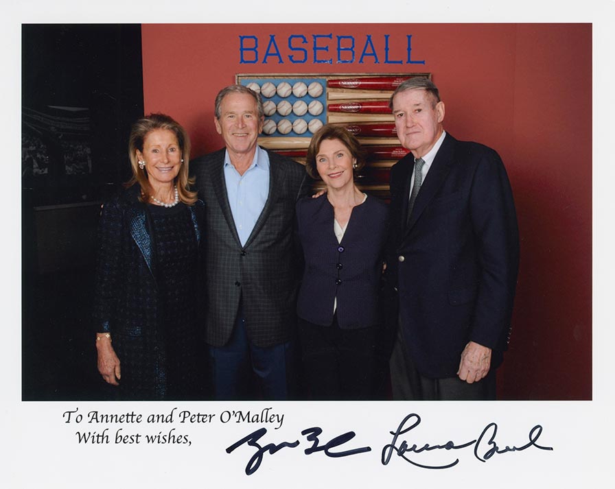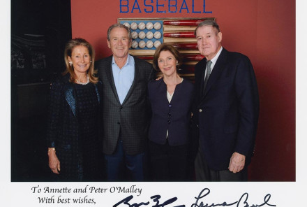 The 43rd President of the United States, George W. Bush, had a baseball connection to Peter O’Malley. Before he was a U.S. President, Bush was a Managing General Partner of the Texas Rangers and enjoyed a close friendship with Peter. When Walter O’Malley was inducted into the National Baseball Hall of Fame, President Bush sends a handwritten letter congratulating Peter and his family while expressing his appreciation for the baseball contributions of Walter O’Malley. President Bush was also invited by Peter O’Malley to be the guest speaker on November 4, 2009 at Waseda University in Tokyo, Japan for the Sports Management Class lecture. On March 20, 2015, O’Malley and his wife Annette attended the Grand Opening for a baseball exhibit at the George W. Bush Presidential Center in Dallas. O’Malley loaned a dozen items for the exhibit.