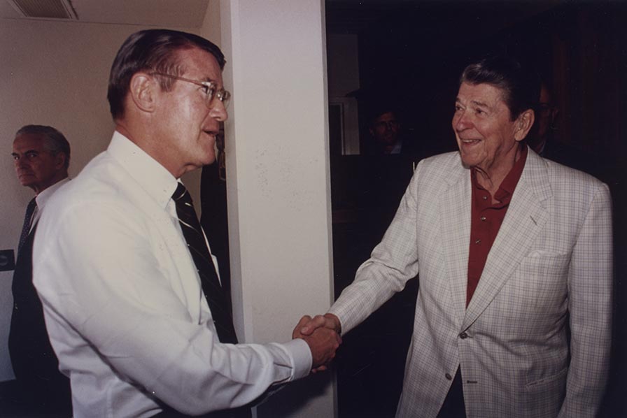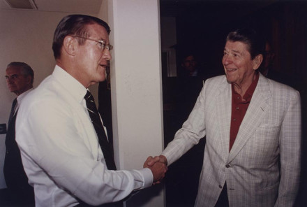 April 12, 1991, Dodger President Peter O’Malley welcomes former U.S. President Ronald Reagan to the Dodger Stadium President’s Box for a game against the San Diego Padres.