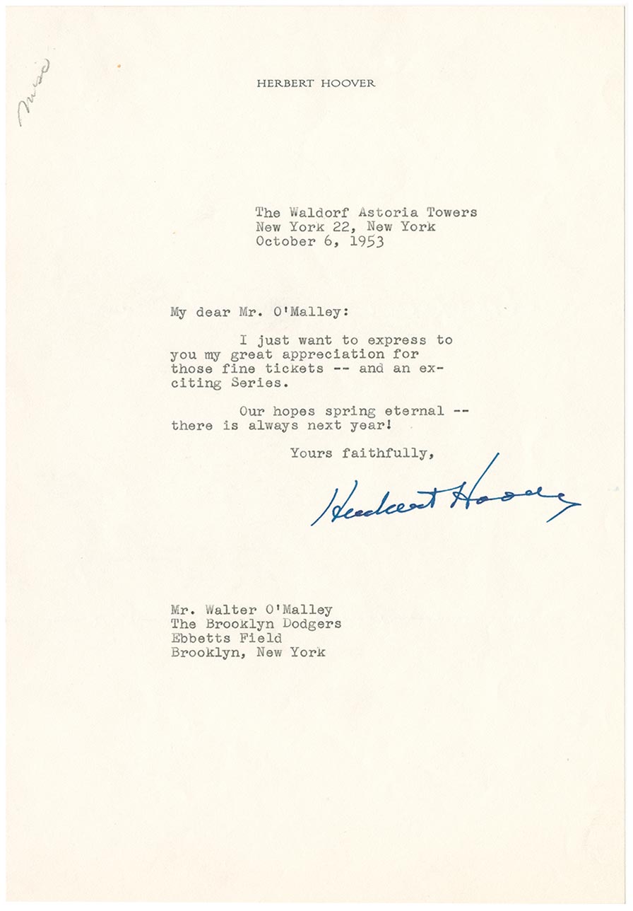 Former U.S. President Herbert Hoover sent his appreciation to Walter O’Malley for the 1953 World Series tickets he received to attend games at Ebbets Field in an October 6 letter.