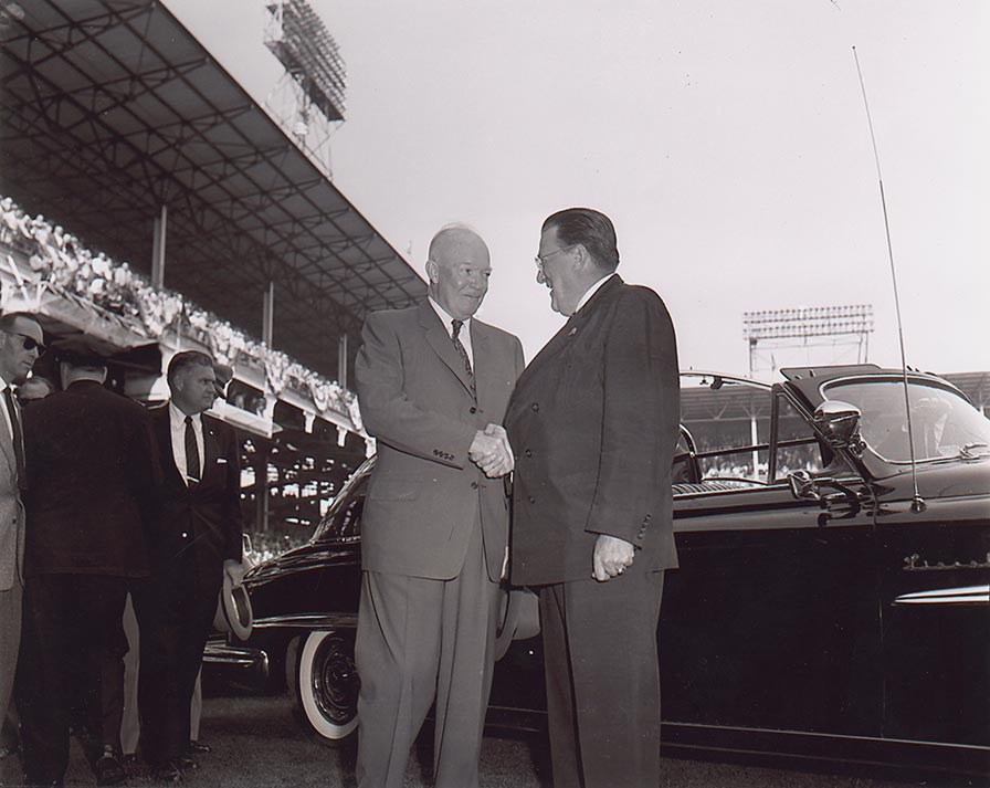 U.S. President Dwight D. Eisenhower arrives at Ebbets Field in an open car and is welcomed by Dodger President Walter O’Malley for Game 1 of the 1956 World Series on October 3. It was the first World Series game attended by a U.S. President since Franklin Delano Roosevelt in 1936.