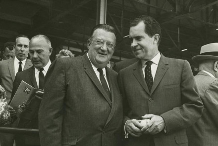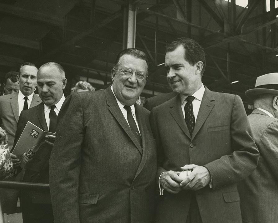 July 8, 1958, Walter O’Malley with U.S. Vice President Richard M. Nixon at Baltimore Memorial Stadium for the 1958 MLB All-Star Game. Nixon threw the ceremonial first pitch.