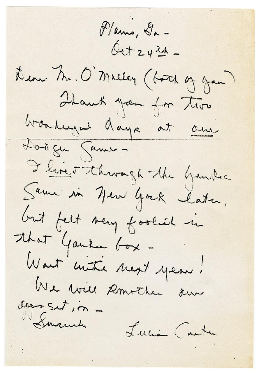 October 24, 1977 handwritten letter from “Miss Lillian” Carter to Dodger President Peter O’Malley following her visit to Dodger Stadium for the 1977 World Series. On October 15, U.S. President Jimmy Carter’s mother threw the Game 4 ceremonial first pitch.