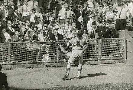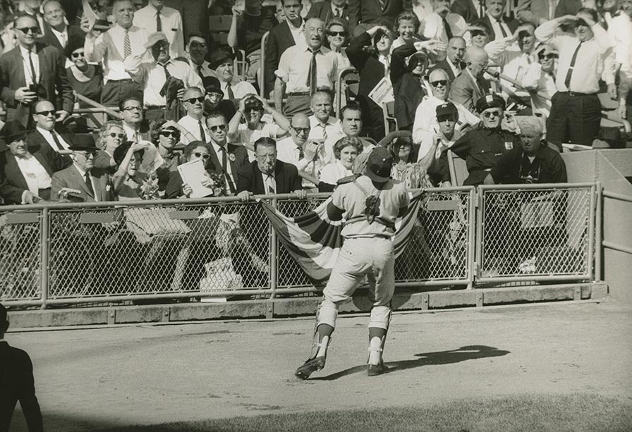 October 2, 1963, Game 1 of the 1963 World Series, Yankee Stadium, New York, Dodger catcher John Roseboro catches a foul pop fly hit by the Yankees’ Elston Howard. In the front row (L-R): Dodger co-owner Dearie Mulvey and her husband Jim; Kay and Walter O’Malley and Patricia Nixon. Second row – Dodger VP Fresco Thompson and wife Peg; Dodger VP Dick Walsh with his wife Bobbie and behind Patricia Nixon is former U.S. Vice President Richard M. Nixon.
