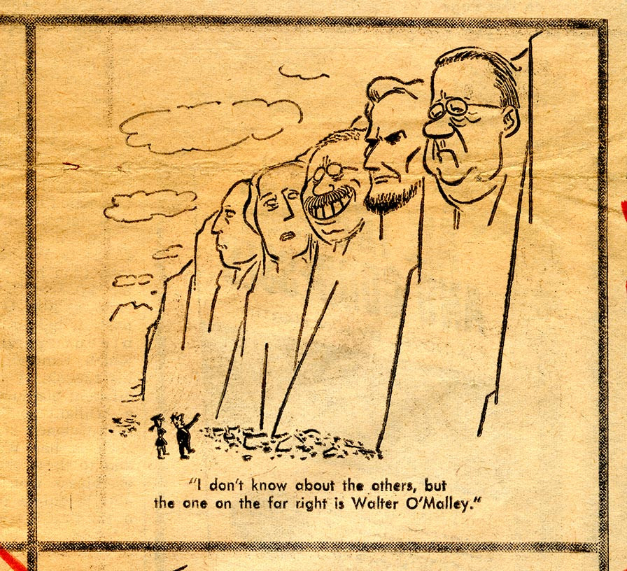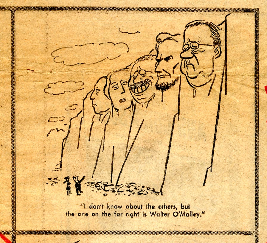 August 18, 1963, talented comic cartoonist Virgil Partch hits it home with Walter O’Malley on the face of Mount Rushmore and a baseball fan knows O’Malley, but doesn’t recognize Presidents Washington, Jefferson, Teddy Roosevelt and Lincoln.