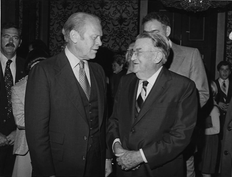 November 20, 1977, former U.S. President Gerald Ford (left) chats with Walter O’Malley at the Beverly Hilton banquet where Ford was honored with the Holy Family Services’ 1977 Gift of Life Award for supporting education and youth.