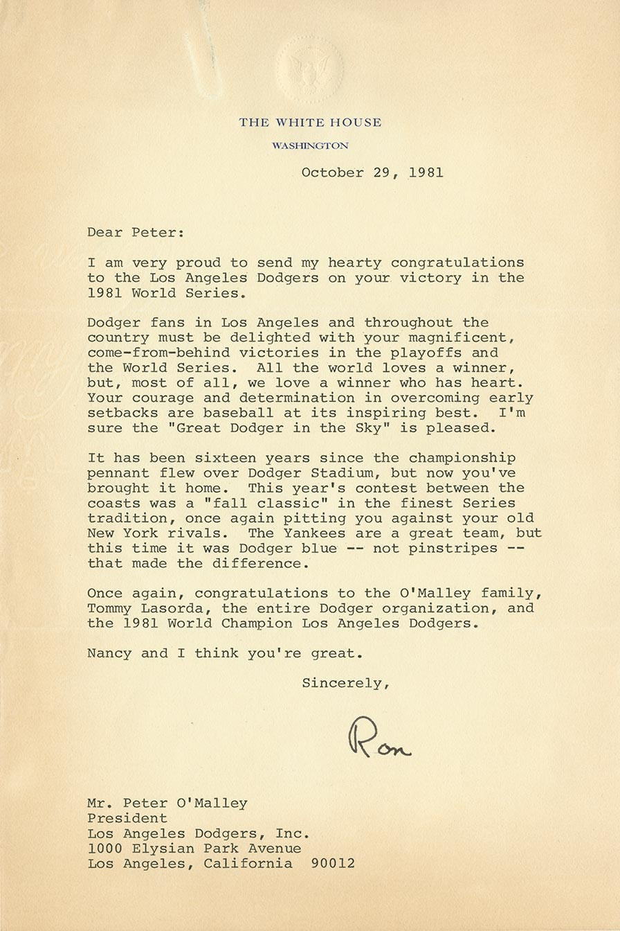 October 28, 1981, U.S. President Ronald Reagan writes a congratulatory letter to Dodger President Peter O’Malley on the Dodgers’ exceptional comeback 1981 World Championship season. He mentions this year’s contest was a “fall classic” against the old New York rivals, the Yankees.
