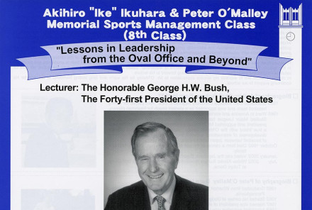 On December 15, 2006, George H.W. Bush, the 41st U.S. President was invited by Peter O’Malley to be the featured speaker at Waseda University, Tokyo’s 8th Sports Management Class. This is the class flyer.