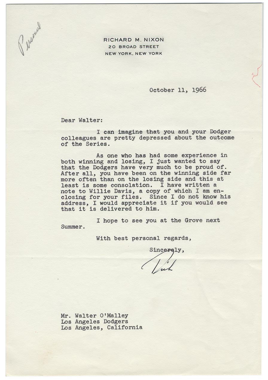 Two days after the Dodgers were swept by Baltimore in the 1966 World Series, Nixon wrote a letter of consolation to O’Malley and included a note for Dodger centerfielder Willie Davis.