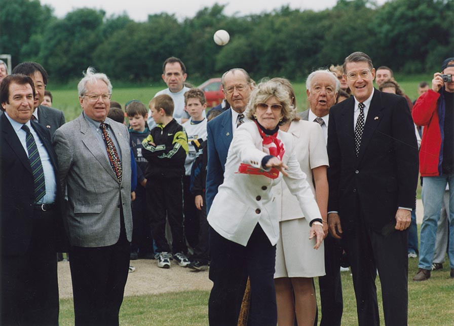 July 4, 1998, Grand Opening Ceremonies for two baseball fields privately built by Peter O’Malley in Corkagh Park, Clondalkin, West Dublin, Ireland. (L-R): Aldo Notari, President, International Baseball Federation; Dr. Creighton Hale, longtime Little League Baseball president; Ed Piszek, Little League Foundation Board of Trustees; Jean Kennedy Smith, U.S. Ambassador to Ireland, throwing the ceremonial first pitch; Rod Dedeaux, legendary USC baseball head coach; and O’Malley.