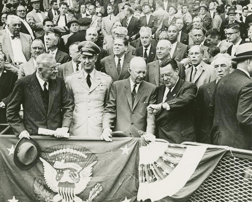October 3, 1956, Game 1 of the 1956 World Series at Ebbets Field, (L-R) John Foster Dulles, Secretary of State, U.S. Army Major John Eisenhower, U.S. President Dwight D. Eisenhower, Dodger President Walter O’Malley and Baseball Commissioner Ford Frick. The Dodgers won Game 1 6-3 over the New York Yankees.