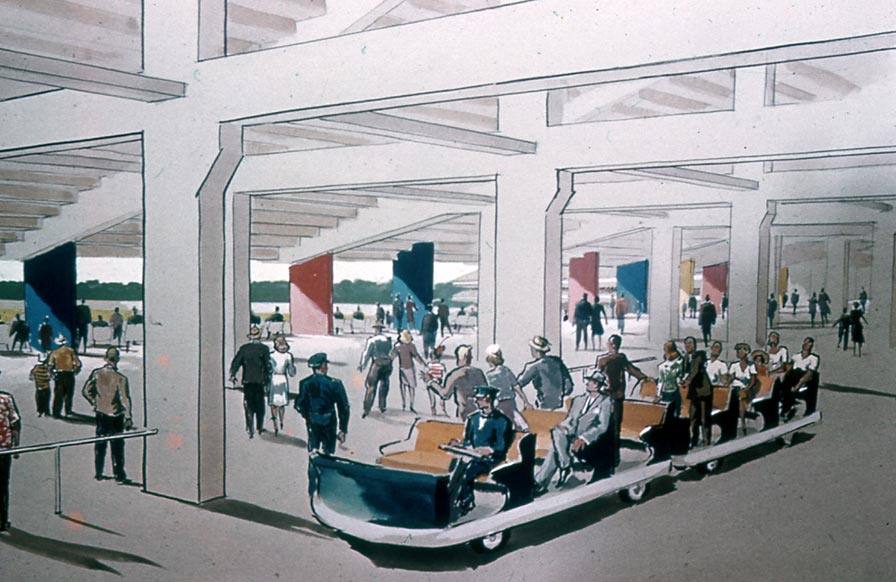 Early concepts of the new Dodger Stadium included ways to shuttle fans from the parking lots to their seats.