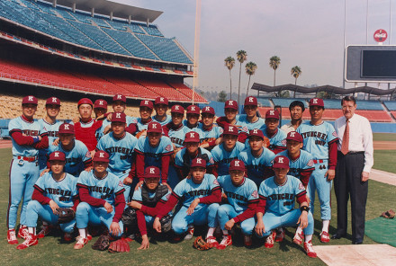 On March 3, 1994, Dodger President Peter O’Malley (right) welcomes the Kyung Hee University baseball team from Seoul, South Korea, to Dodger Stadium, Los Angeles.