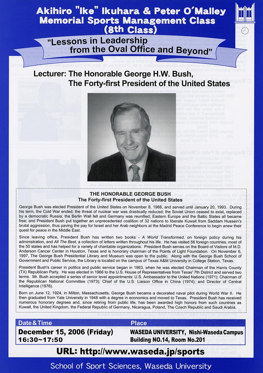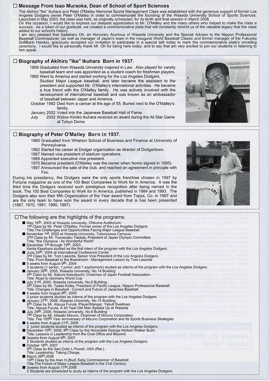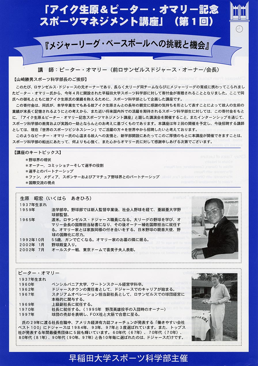 On May 16, 2003, Peter O’Malley, President, Los Angeles Dodgers (1970-1998) was the speaker at the 1st Akihiro “Ike” Ikuhara and Peter O’Malley Memorial Sports Management Class at Waseda University, Tokyo. This is the flyer from the 1st class which covered the topic “the Challenges and Opportunities Facing Major League Baseball”.