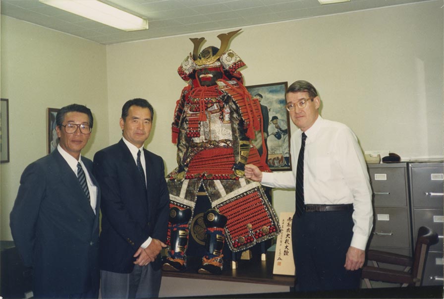 In recognition of the longtime friendship between the O’Malley family and the Shoriki family, Yomiuri owner Toru Shoriki sent two former Giants players and managers, Motoshi Fujita (far left in second photo) and Shigeo Nagashima, (second from left in second photo) both in the Japan Baseball Hall of Fame, to Dodger Stadium to present this replica suit of armor to Dodger President Peter O’Malley (right in second photo) on January 29, 1988. Tetsuharu Kawakami, a third Giants’ Hall of Fame player and manager, was also involved in the impressive present expressing appreciation to Peter and the O’Malley family. The O-Yoroi, or Great Armor, was worn by Japan’s highest-ranking samurai from the 10th through 14th centuries. Shimazu Yoshihiro, feudal lord of the Satsuma Province during the late 16th Century, was captivated by the form of the Great Armors. This piece is modeled after Yoshihiro’s personal suit of armor. It has been modified to showcase the family crest of the Tokugawa Clan, to whom the Shimazu pledge their loyalty at the close of the Warring States Period (1467 -1600).
