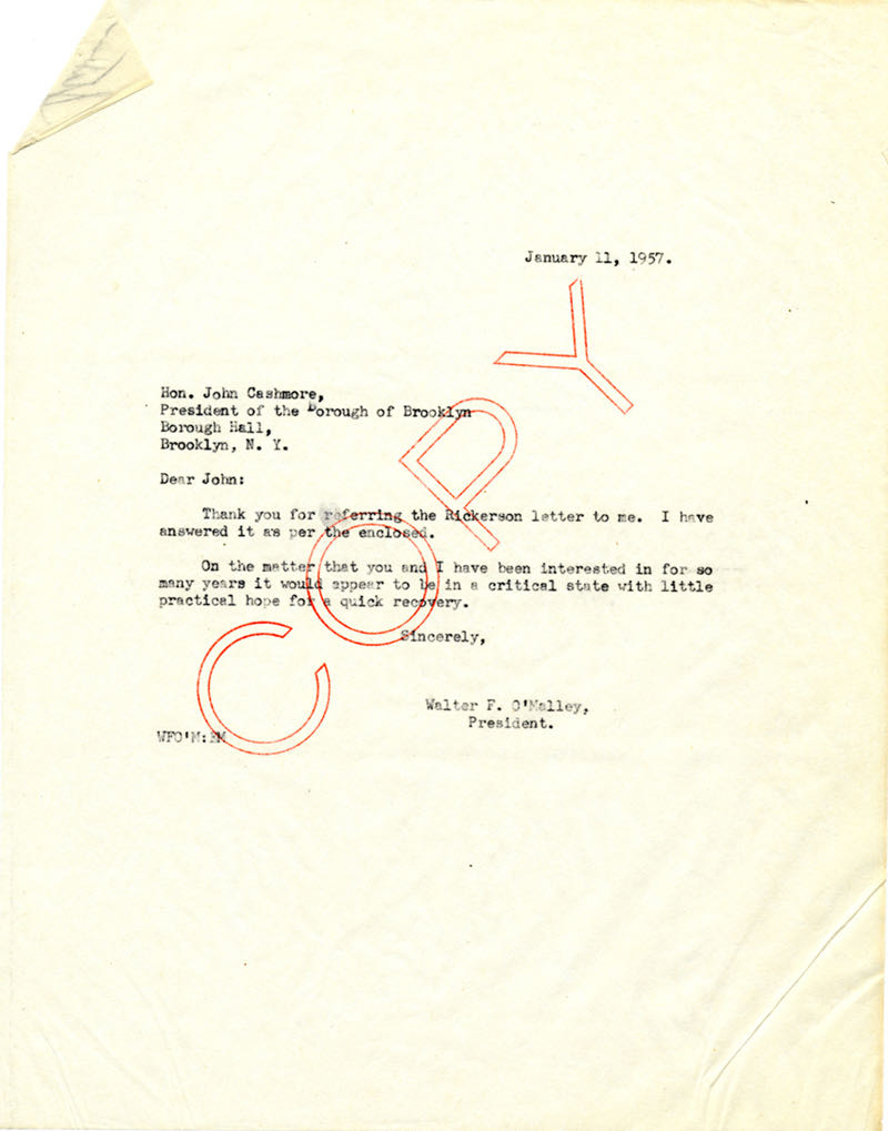 Letter from Walter O’Malley to John Cashmore Business Correspondence January 11, 1957 Back to Listing Letter from Walter O’Malley to Charles Rickerson Letter from Walter O’Malley to Joseph Sharkey John Cashmore was President, Borough of Brooklyn. Download PDF