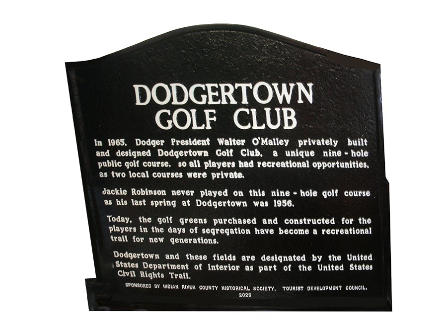 The Florida Historic Marker with Dodgertown Golf Club on one side was dedicated on November 8, 2025 in Vero Beach, Florida. The two-sided marker commemorates the advancement in civil rights as Dodgertown Golf Club, opened in 1966, became the first public golf course in Vero Beach and Indian River County and was integrated.