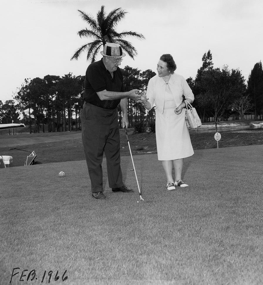 Walter O’Malley and his wife Kay are on the new Dodgertown Golf Club, a nine-hole course which was dedicated on February 28, 1966. O’Malley built and designed the public course so all Dodger players could enjoy golf, including many African Americans that were on the roster that year (Tommy Davis, Willie Davis, Jim Gilliam, Maury Wills, John Roseboro, Lou Johnson, Willie Crawford, and Nate Oliver).