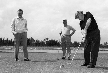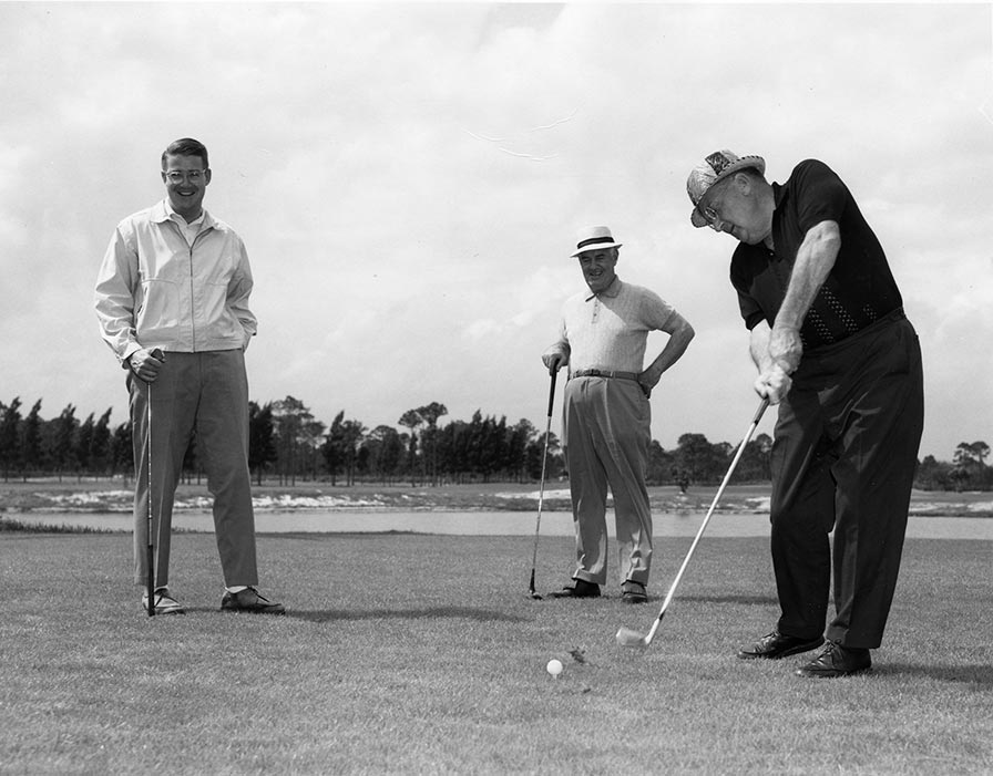 In February, 1966, Walter O’Malley (right) plays a round of golf on the Dodgertown Golf Club, Vero Beach, Florida with his son, Peter (left) and Dodger Vice President and Minor League Director Fresco Thompson.